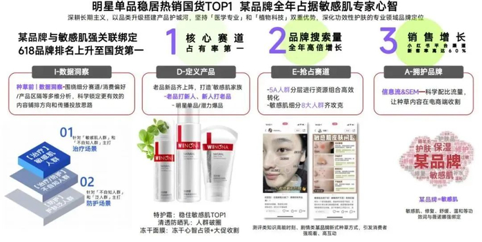 卓尔数科善于从营销趋势中持续洞察,在美妆营销领域,卓尔数科亦沉淀了大量可复用的方法论,在某头部美妆品牌案例中,卓尔数科技基于IDEA(I-数据洞察—D-定义产品—E抢占赛道—A拥护品牌)策略,基于其产品的市场定位,从其所处的细分赛道/消费偏好/产品区隔等多维进行深入分析,科学锁定更有效的内容铺排方向和传播投放思路,抢占功效性护肤赛道,科学配比流量,实现销量和声量齐提升,最终助力该品牌深入用户心智,并在618期间品牌排名上升至国货TOP1。
