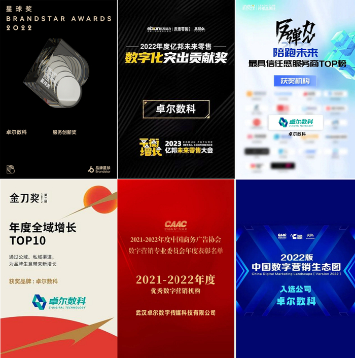 深耕迎硕果!作为中国领先的营销科技公司,卓尔数科凭借专业的营销能力和出众的服务水平,不断收获新荣誉,硕果累累,于近日接连斩获星球奖BrandStar Awards 2022 “服务创新奖” 、多赛道入选《中国数字营销生态图(2022版)》、2022年度亿邦未来零售“数字化突出贡献奖”、「金刀奖2022」 “全域增长榜单TOP10”、消费界2022年度「反弹力」“陪跑未来最具信任感服务商TOP20”和中国商务广告协会“2021-2022年度优秀数字营销机构”六项大奖!