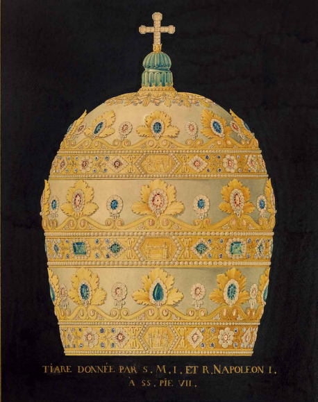 此件作品虽因历史变故,导致贵重宝石陆续被拆卸,浅浮雕也被磨除而失去昔日华彩,但我们依然可以在一幅设计图中窥见其奢华原貌:三重冕为白色绒面底,由三层重叠的金冠组成。每层金冠都具有带状珍珠缘饰,上有六边形浅浮雕纹饰,其主题分别为恢复天主教在法国的合法地位的活动(1801年)、签订《教务专约》(1802年)和举行加冕典礼(1804年)。卷涡纹之上带有花叶饰和葡萄叶。一颗硕大的雕纹祖母绿雄踞于皇冠顶部,这枚祖母绿是拿破仑1797年根据《多伦蒂诺条约》从梵蒂冈珍宝中取走的无价之宝。但他通过将这枚宝石镶嵌在三重冕之上,再将其送还给梵蒂冈教皇的方式“完璧归赵”,堪为高明之举。