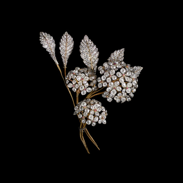 约瑟芬皇后之女、荷兰王后奥坦丝贴身女侍官柯雪来记录的支出簿,证实了奥坦丝往后是CHAUMET尊贵顾客的史实。尼铎之名自1807年10月见簿,预付款12000法郎。在荷兰皇后自己的订制外,约瑟芬还为她的女儿从CHAUMET处订购了一系列作品,其中以一枚绣球花胸针最为精妙。法语“hortensia”发音与Hortense的名字恰好谐音,于是,这枚为“女儿”而作的胸针便顺理成章、令人动容、又充满惊喜地取材这种花卉。与此同时,这件作品也采用了当时并不多见的的微弹簧(可颤动式珠宝镶嵌)工艺——随着佩戴者的步履,作品会轻盈摇晃,传神复原植物的神态,充满生机与趣味。