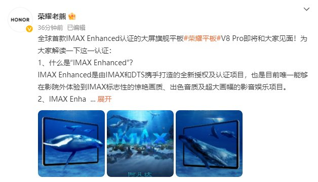 为此,荣耀产品线副总裁@荣耀老熊发微博长文介绍全球首款IMAX Enhanced认证的大屏旗舰平板荣耀平板V8 Pro。历经调测,通过IMAX Enhanced 严格性能标准和认证流程,为用户打造足不出户的IMAX影音盛宴。