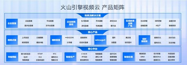 根据今年2月火山引擎公布的最新视频云产品矩阵显示,目前火山引擎已经形成包含泛互联网、游戏、金融、广电等场景,以及视频点播、veImageX、实时音视频等核心产品在内的完整解决方案。其中最底层的核心中台,建立在火山引擎服务抖音、西瓜视频等优秀应用积累和沉淀下来的技术能力之上,覆盖网络传输、智能生产和智能处理全链路的能力。