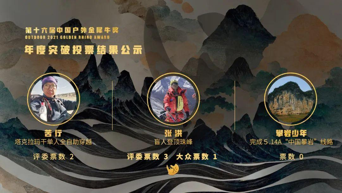 也如《户外探险》出版人、金犀牛奖组委会主席吕晖所说:“金犀牛奖16年,它既是一个记录者,更是一个传播者。挑战极限背后所蕴含的坚持、努力、向上的精神,以及尊重自然、和谐包容的生活态度与生活方式,既是中国户外运动的精神,也是中国人的精神。生活就是一条山路,道阻且长。我们筚路蓝缕,但依然坚持,依然热爱,依然热血澎湃,这才是户外运动,才是金犀牛英雄带给我们的真正意义。”