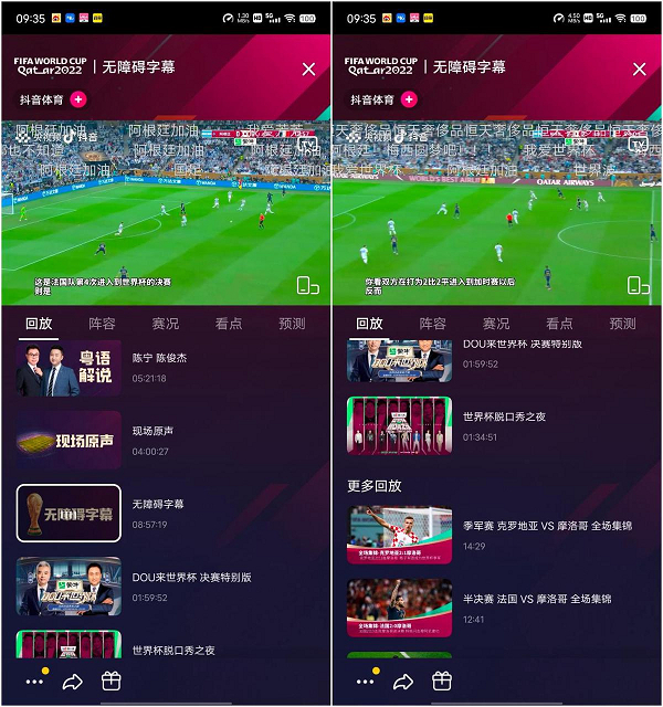 而本届世界杯,抖音“无障碍直播间”,则不仅提供比赛直播的声音和画面,还将主持人、解说员所说的话实时转写成文字字幕,满足了更多人的观赛需求。