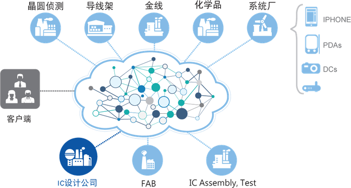 芯片IC设计解决方案:针对IC设计业中刻号/批号/Datecode/BIN管理等重要议题,通过信息化、数字化来提高产业供应链协同,并从产品开发、接单、生产到出货各环节的资讯透明化,达到缩短项目设计周期、降低设计成本之目的进而提升竞争实力。同时,方案可强化委外制程管控,提升订单达交能力。除了提供业界较重视的外包回货与外包进度(WIP Status)、自动发委外工单,也提供企业更精准的成本分析,与各项销售预测分析、项目管理,另外在虚拟工厂的实时管理与智能排程方案,让供应链整合更加实时与智慧。