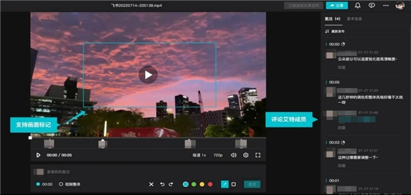 传统团队视频创作中,审阅修改过程大多繁琐,需要将较大的视频文件,反复在团队成员间传阅,修改沟通也较为不便。通过剪映团队协作功能,剪辑后的视频储存于云端,一键生成分享链接即可以网页形式分享至其他用户,从而解决文件大、传输慢,反复上传的痛点。修改时,用户可精准定位每一帧进行批注,添加箭头、选区、评语,并通过视频时间轴中随时编辑记录,方便团队高效沟通。