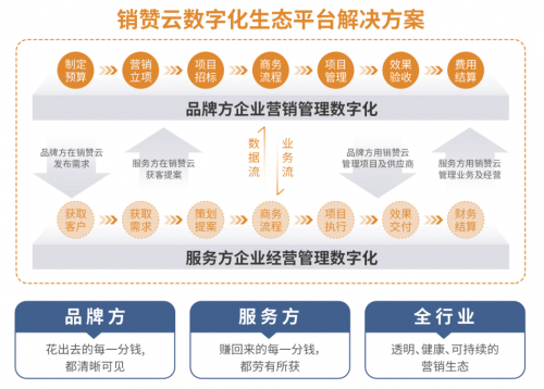 传统的营销业务链信息不透明、个人偏好决策等痛点,导致品牌方的营销投入产出是一本糊涂账,服务方的公司经营更是根本没法算账,行业逐渐陷入关系重于专业的恶性循环。销赞云致力于打造营销行业数字化平台,并持续投入1个亿做行业推广,与行业伙伴共同建设一个公开、透明、健康的营销生态。