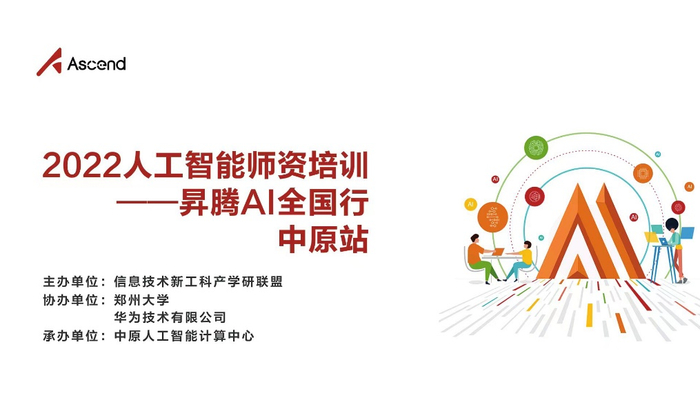12月22日,由信息技术新工科产学研联盟主办,郑州大学、华为技术有限公司协办,中原人工智能计算中心承办的“2022人工智能师资培训-昇腾AI全国行 中原站”成功举办。来自郑州大学、河南农业大学、河南理工大学等12所高校的老师线上参与课程,共同分享昇腾AI基础软硬件技术知识,探讨校企融合下的学科建设与人才培养新模式,旨在为中原地区人工智能产业发展与AI人才培养献计献策。