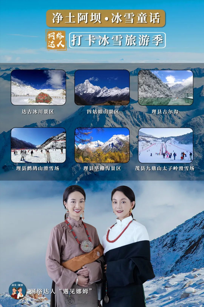 在“冰雪童话”的盛情邀约下,网络达人“遇见娜姆”将打卡阿坝州冰雪旅游季,以视频创作发布、在线直播等形式对阿坝州滑雪、温泉、登山、攀冰等冬季特色资源和产品进行全方位展示,在线上开启一段净土阿坝的童话之旅,助力“全国自驾旅游第一州”“童话公路”品牌打造。