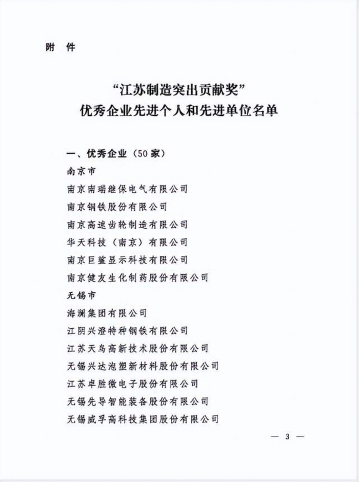 “江苏制造突出贡献奖”由省委、省政府主办,旨在提振制造业发展,营造建设制造强省的良好氛围。其中优秀企业要求产品具备较强的市场竞争力,具有较大影响力和知名度,尤其在推动创新发展、智能制造、绿色制造等方面具有引领示范作用。