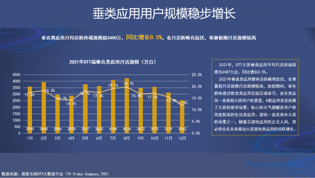 然后以智慧大屏垂类应用活跃规模、增长数据、大屏短视频应用活跃数据,揭示智慧大展多元化应用价值逐渐展露头角。参见下图数据: