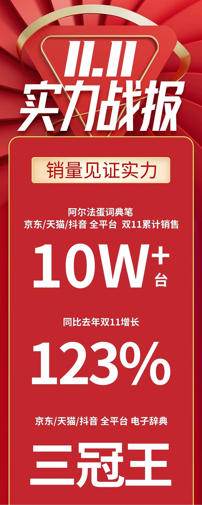2022年“618”期间,阿尔法蛋AI词典笔斩获天猫、京东、抖音三大平台销量冠军;“双11”期间,阿尔法蛋词典笔在京东、天猫、抖音全平台累计销售10W+台,同比去年双11增长123%,荣膺京东、天猫、抖音电子辞典品类三冠王。