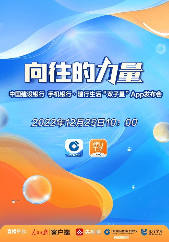 2022年12月25日上午10时,中国建设银行召开“向往的力量——中国建设银行‘双子星’App发布会”。发布会通过“中国建设银行”微信视频号、建行学习App、人民日报App、央视频App、央视频抖音号、央视频官方微博等平台同步播出,向社会公众隆重推出手机银行2023,并发布“建行生活”全新升级品牌。