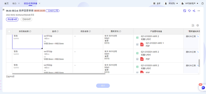 (2)图纸变更:系统自动侦测到图纸版次变更,通过知识中心-图档管理,自动将在询价中或采购中的相关单据推送到采购人员工作看版,只需要勾选就能自动发送最新版本的图纸给供应商。