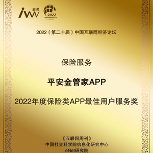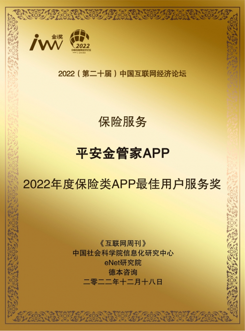 12月18日,在中国科学院《互联网周刊》、中国社会科学院信息化研究中心、eNet 研究院、德本咨询联合主办的“2022(第二十届)中国互联网经济论坛”中,平安金管家APP 荣获 “2022年度保险类APP最佳用户服务奖”。“以客户为中心,通过科技赋能,提升服务,改善用户体验。”这一理念获得了行业及用户高度认可。