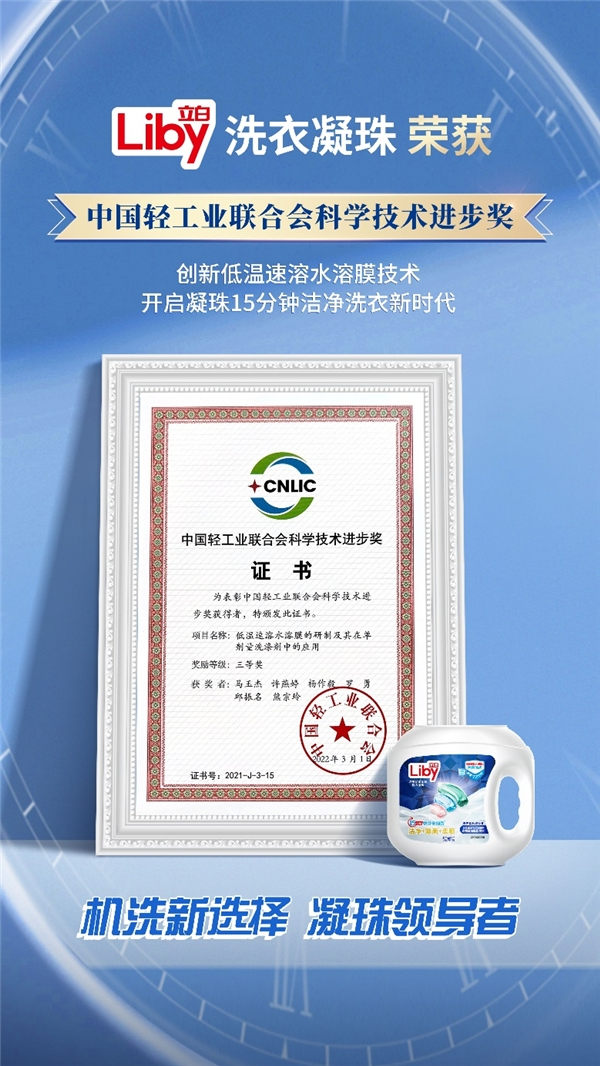 为何Liby在洗衣凝珠市场始终处于领先地位?一方面来源于立白的科技实力。以立白创新研发的低温速溶水溶膜技术为例,该技术让Liby洗衣凝珠的水溶膜实现机洗遇水25秒速溶,溶解速度比市面上常规产品快一倍,填补了洗衣凝珠对比洗衣液的最后一块短板,引领家清行业升级换代。凭借《低温速溶水溶膜的研制及其在单剂量洗涤剂中的应用》,Liby获得中国轻工业联合会科学技术进步奖,成为首个获此奖项的家清产品。目前,立白拥有132项发明专利授权,以领先的科技创新实力为企业发展提供坚实的战略支撑。