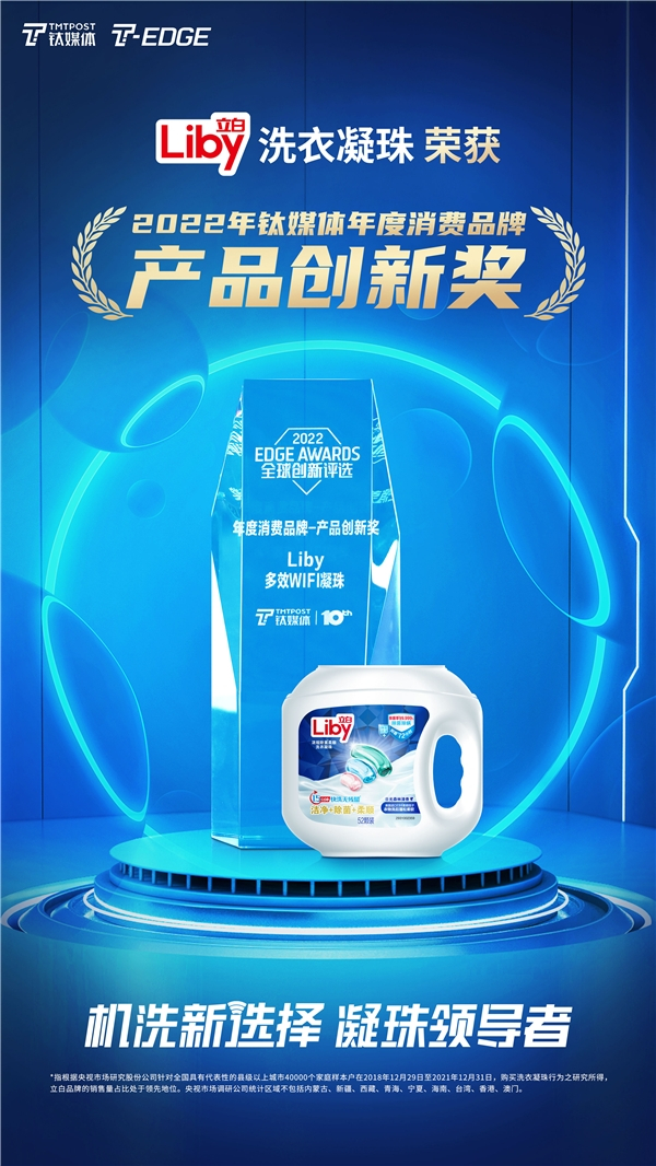 12月23日,2022钛媒体全球创新大会暨全球创新评选年度盛典(简称T-EDGE)在北京举行,科学家、经济学家、企业家、投资家齐聚,共同展望未来十年产业演进的新动能和新逻辑,一起展卷中国创新经济新十年生态图谱,向不断推动行业变革的创新引领者们致敬,来自快消、汽车、科技、互联网、医疗健康、出行等等20大行业的近500个品牌也参与到各类创新奖项的角逐中。立白集团旗下专为年轻人提供更创新便利衣物洗护方案的年轻品牌Liby,凭借多效WIFI洗衣凝珠荣获年度消费品牌产品创新奖。这也是继中轻联颁发的科学技术进步奖以及天猫金妆奖-年度超级新品奖后,Liby多效WIFI洗衣凝珠收获的又一项殊荣。