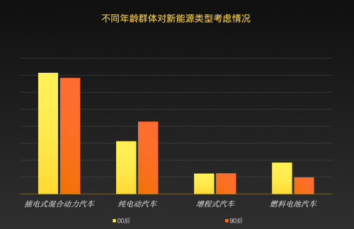 近年来,新能源汽车产业迅速发展,今年前11月,中国新能源汽车累计销量605.8万辆,同比增长103.56%。电动化、智能化的新能源车同样是年轻用户的偏爱车型。报告指出,90后比00后更了解新能源汽车,在不同的能源动力车型中,插混车型受到00后和90后的普遍青睐,但90后选择纯电车型的比例远高于00后。