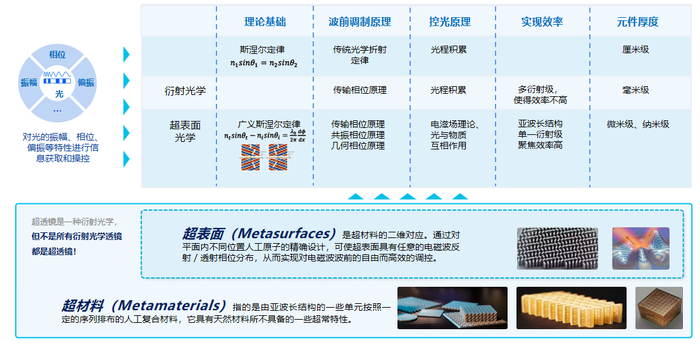 超表面 是由一系列平面型人工原子按特定排列方式构建而成的二维超构材料。通过对平面内不同位置人工原子的精确设计,可使超表面具有任意的电磁波反射/透射相位分布,从而实现对电磁波波前的自由而高效的调控。根据美国勒克斯研究(LuxResearch)公司发布2021年分析报告,预测超表面光学产业未来将具备500亿美金市场的潜力。