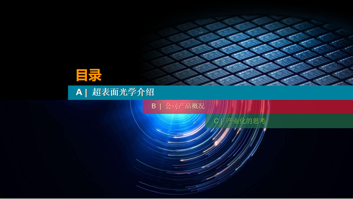 马耀光教授的报告主要从三方面讲述,分别是超表面光学介绍公司发展概况以及关于产业化的思考