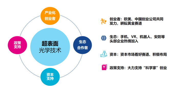 一是硬科技产业化绝非一蹴而就,需要各方努力构成闭环。首先需要全球创业者共同发力,耕耘黄金赛道。其次需要手机、VR、机器人、安防等各行各业的头部企业热情加入,形成超表面产业“生态”。同时还需要资本市场看好赛道、积极布局。当然还需要政策支持,大力支持黄金赛道发展、支持“科学家”创业。