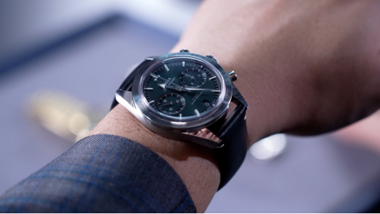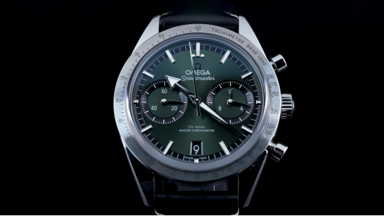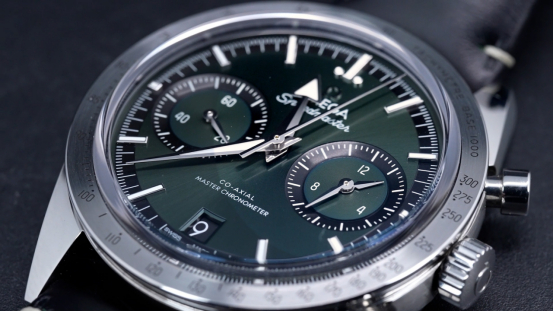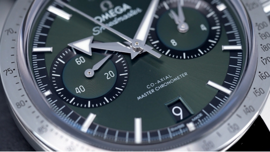 但如果说你还是比较喜欢传统风格的放射状太阳纹,其实欧米茄超霸'57的另外两个配色可以看一看,一个是蓝色,一个是绿色,这个绿色其实蛮有意思的,粗看是有点偏灰绿的感觉,但因为它采用放射纹,所以说在阳光下照耀会让人觉得眼前一亮,颜色在蓝色和绿色之间。我个人觉得这两年腕表很流行绿色,而它不是很刺眼的绿色,而是带有一些深邃感的绿。我个人觉得这个盘面的颜色更适合一些平时相对低调或文艺范、小清新范的人。