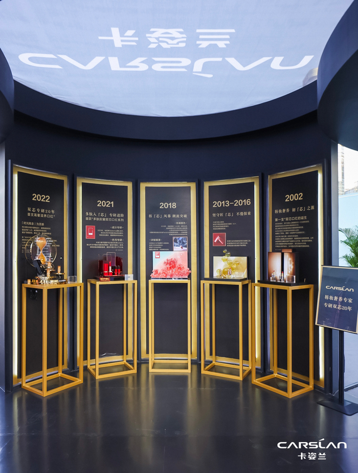 在品牌展区,卡姿兰带来双芯20年匠心传承与高奢双芯新品的产品故事,呈现于精心打造的展览空间,供消费者们细细鉴赏。