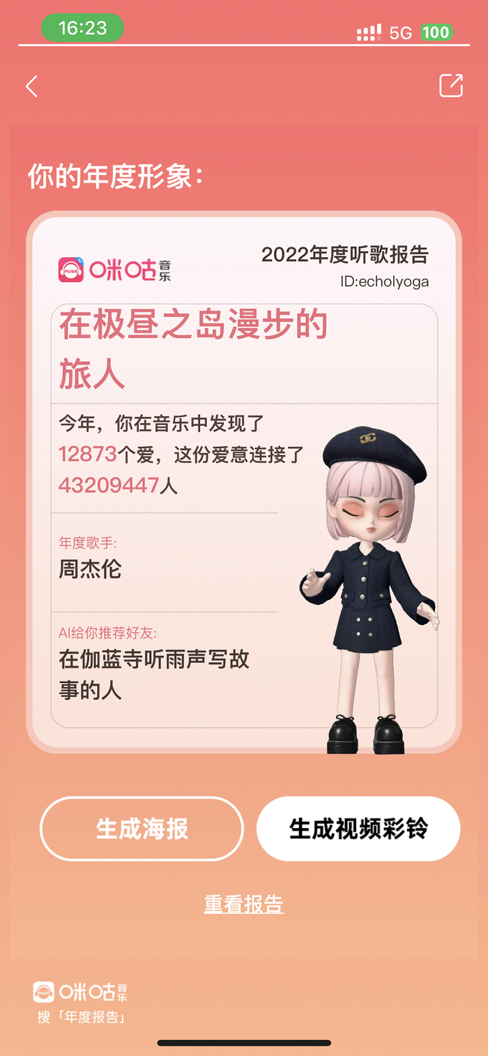 2022年进入最后倒计时,咪咕音乐年度听歌报告如约而至,开启一年一度的专属仪式感。今年的听歌报告以“爱”为主线,创新采用AI绘画生成符合用户音乐气质的艺术作品,并首次将3D Avatar(即3D虚拟形象)及5G视频彩铃引入报告,引发广泛讨论和刷屏外,也为用户带来了一份年末定制的“独家记忆”。