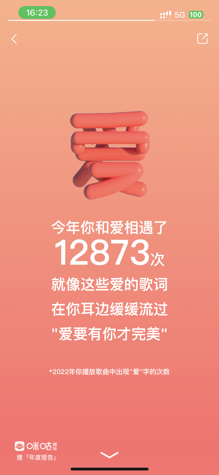 遇见爱的美好,也在一次次分享中传递给更多人。除了在音乐中遇见“爱”的次数,报告还呈现了用户在咪咕音乐与多少人一起分享过“爱”。当同一首歌中的爱,让许多不同的人感受到力量,音乐的魅力与温度也就由此显现。咪咕音乐的这一巧思,既呼应了本次年度报告的主题,也处处体现着平台对用户的关注与爱。