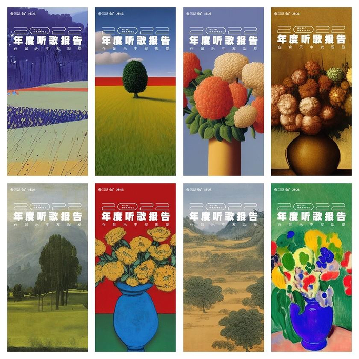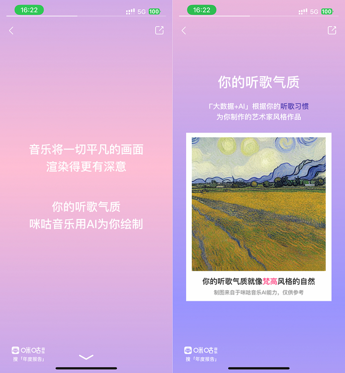今年的听歌报告不仅在数据上用心呈现,还专门引入当前大热的AI绘画,联动AI大数据,根据用户曲风标签、喜好歌手、听歌时间段、听歌节奏、听歌场景等听歌习惯,通过AI为用户私人定制符合其听歌气质的名家风格绘画作品,为用户带来别出心裁的满满仪式感。
