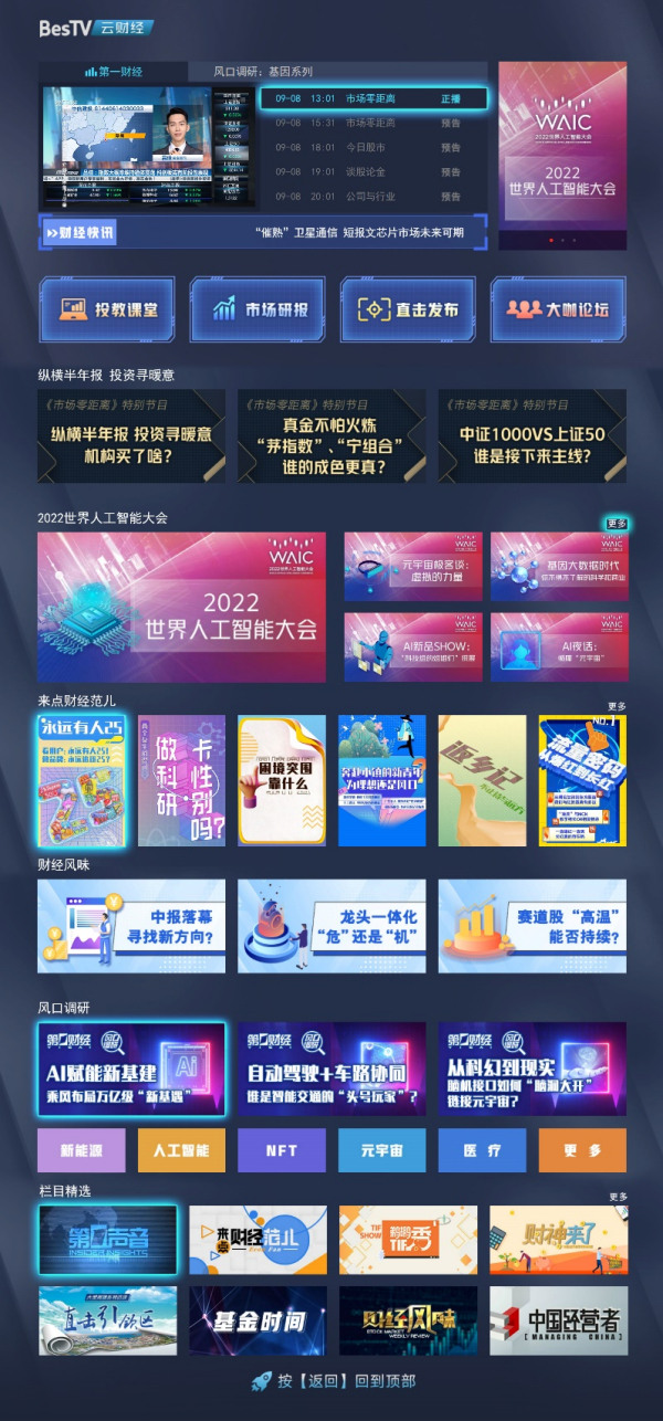 2022年,百视通与国内领先的财经媒体第一财经合作,共同在IPTV平台打造“BesTV云财经”专区,并在互联网电视平台同步推出“BesTV一元财经”大屏产品,致力于成为“陪伴式大屏专业家庭财经顾问”,设有“跟盘直播”、“高端现场”、“投教课堂”等精品栏目,全年提供超过2000小时高价值财经直播,另外还有近500小时优质点播内容。
