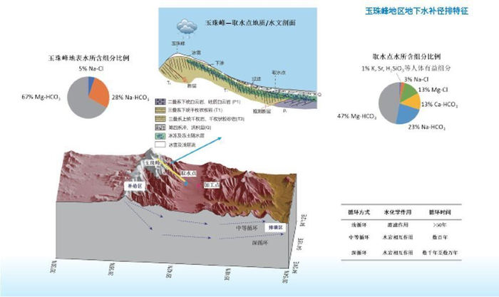 《报告》对我国珍稀的世界级黄金水源地——昆仑山玉珠峰水源地的地貌环境、水文特征、水质特点进行了详尽的分析,并揭示了昆仑山玉珠峰珍稀天然矿泉水水源卓越品质的成因:玉珠峰海拔6178米,位于青海格尔木。其冰雪来源于青藏高原地区几乎无污染的水汽补给,这些水汽因为巨大的盆山地形差产生的山地效应冷凝,最终以冰雪的形式降落在玉珠峰顶部区域。洁净无污染的水源渗入地下,经过超过五十年的循环过滤,不断与围岩发生水岩相互作用。围岩内部对人体有益的优质微量元素钙、纳、镁等进入水中,最终形成了天然优质的矿泉水。
