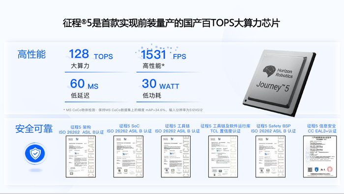 最新的一款芯片征程5是国内首款实现前装量产的国产的百T算力的大算力的芯片,我们这款芯片是128T的算力,同时拥有非常高的性能,现在在行业大家都能够形成一个共识,就是以FPS,就是每秒识别多少帧来计算的效率去衡量一个计算芯片,我们这个FPS到了1531,而且随着我们的软件编译器的不断优化,这个FPS也在不断进化。这款芯片也有低延时,低功耗的特点。征程的芯片在它的架构上,在它的SOC上,在它的工具链以及工具软件的开发环境上,以及BSP,还有它的信息安全都得到了广泛的认证的认可。目前征程5已通过AEC-Q100车规可靠性验证与ASIL B功能安全产品认证,能够为前装量产应用提供充分安全可靠性保障。