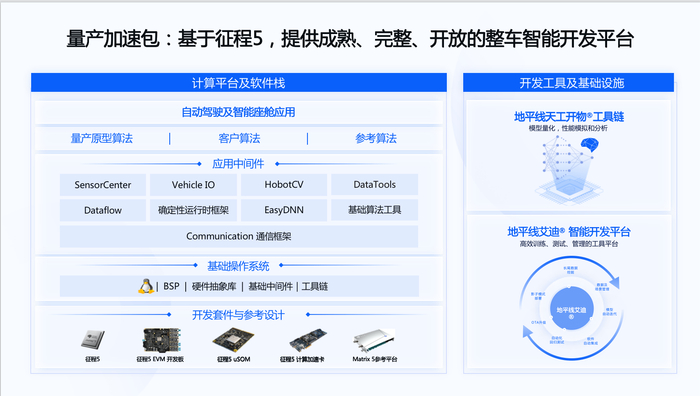 我们基于地平线在量产当中丰富的经验,我们能够为我们的合作伙伴去提供量产的加速包,我们既可以提供开发的套件与参考的设计,同时我们也有天工开物®工具链,以及我们艾迪®智能开发平台,以及我们的应用的中间件,来为上面的软件提供更好的支持。