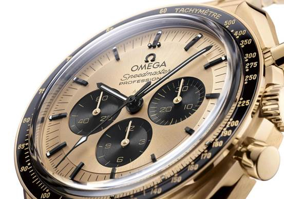 这款作品最打动我的地方就是欧米茄独创的 Moonshine 18K 金这个材质了。前面说的郑钧戴着就是这款绿金霸。我选择了黑金霸。