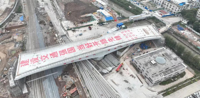 12月17日凌晨0:31,在两台连续张拉千斤顶对称匀速拉动牵引下,广州白云站综合交通枢纽一体化建设工程配套市政道路项目,铁路东线SF、SG匝道非对称曲线转体桥跨越京广铁路,经过85分钟后成功“华丽转身”,标志着该项目重要施工节点顺利完成。