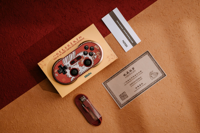 作为限量版的产品,收藏证书必不可少。“风华如卯兔,奔月登新高”的宣传主题,带着浓浓的春联味道和满满的真诚祝福,体现出八位堂(8BitDo)品牌厚重的文化内涵和人文关怀,可以说是一款非常适合用来做新春伴手礼,或者进行收藏的产品。