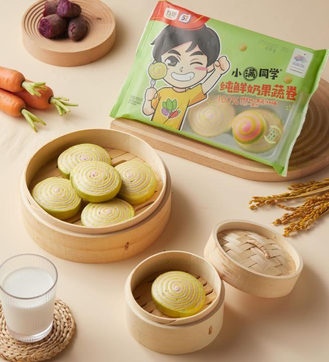 小满同学果蔬卷,采用100%纯鲜奶果蔬汁和面,不加一滴水,不加植脂末等各类添加剂,采用胡萝卜汁、紫薯、菠菜纯果蔬上色,巧妙的将食品安全隐藏在产品的每一道小细节里。