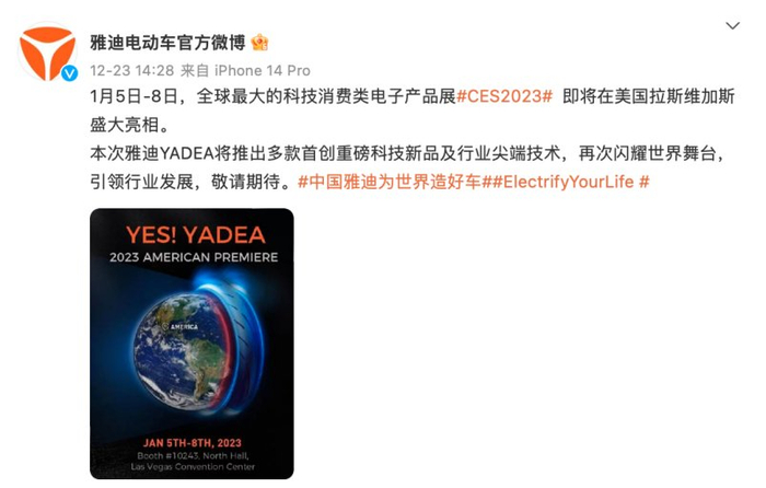 2023年1月5-8日,全球最大的科技消费类电子产品展(International Consumer Electronics Show,下称CES)即将在拉斯维加斯盛大揭幕,这个拥有56年历史的著名展会再一次汇聚全球目光。而日前,全球两轮电动车领导者雅迪也在其官方微博发布神秘海报“YES! YADEA”,释放其将参展CES 2023的信号。据悉,雅迪此次将携多款重磅科技新品及首创尖端技术亮相世界舞台,为全球用户带来融合科技智能、设计美感与续航实力的两轮电动出行新方案。