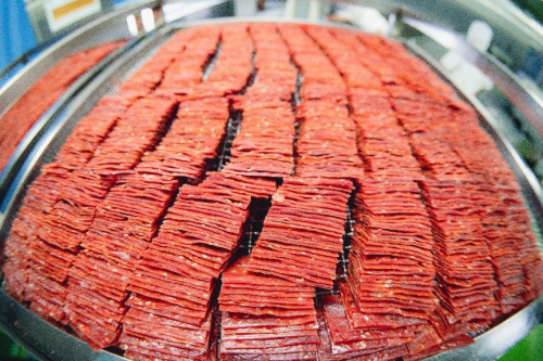 “按良品铺子的要求,一头猪只能用两只后腿上的四块肉,算下来大概两斤鲜肉才能制作出一斤肉脯。”工厂生产负责人介绍,良品铺子对工艺的要求严苛到毫米,“肉切薄了不容易摊筛成型、切厚了影响均匀度和口感,以经典肉脯为例,良品铺子经过多次调试最终将肉片厚度定为2.5毫米,多一点少一点都不行。”