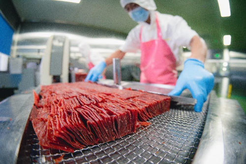 肉脯要香,烘烤前的脱水是关键环节,良品铺子将工艺标准定为分段控温脱水6-8小时,达到设定的各项指标才能进入烘烤;为了保证风味和品质,肉脯从切片到包装都在10万级净化车间完成。