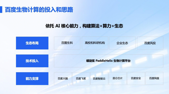 据百度智能云生命科学行业解决方案总监徐强介绍,百度在生物计算领域的思路是依托AI核心能力,构建算法+算力+生态。