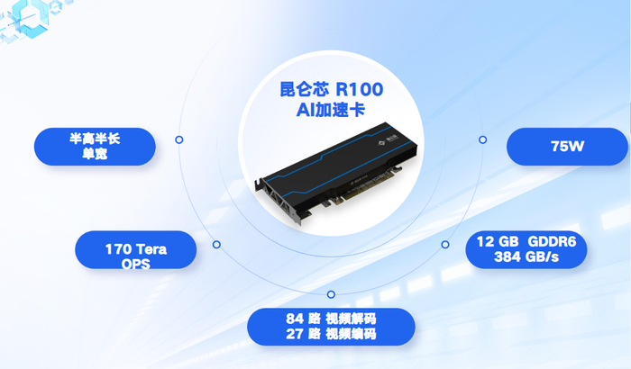 随着AI在各类复杂业务场景落地,灵活部署愈发重要。昆仑芯科技高级产品经理饶玉发布面向边缘推理的昆仑芯AI加速卡R100,定位“边缘大算力推理”,支持PCle4.0接口,支持最大每秒170万亿次计算,既可以在标准服务器中灵活实现多卡配置,又适用于对工控机等对服务器尺寸有特定要求的设备,服务各类边缘推理场景。