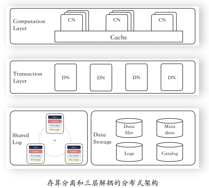 基于这样的设计理念,MatrixOne 引擎的顶层设计架构,可以大致分为三层:计算层、分布式事务层和共享存储层。其中,计算层是由多组计算资源组成的,其中计算单元我们称之为 CN,每个 CN 可以承担不同的任务,但无论 CN 用于何种用途它本身是不保存任何状态的,以保证计算层是可以任意扩缩容的;再往下面一层是 Transaction Layer,这一层承担了分布式事务处理的相关工作。分布式事务层选择了 share-nothing 的模式,由于每个 DN 之间需要处理的数据范围各不相关,这样做的好处在于,每个 DN 只需要负责自己这部分数据的冲突检测,从设计上简化了 DN 的实现复杂度和扩缩容的难度;再往下是两个服务,一个是 Log service,为 DN 提供高性能的分布式高可用的日志读写服务,它直接决定事务写性能的关键;另外一个是共享存储,这里不仅支持 S3 这类对象存储,还支持 NFS 以及 HDFS。