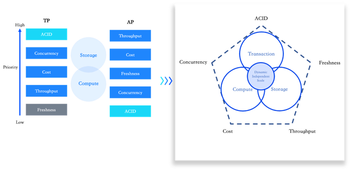具体来说,用户对于 TP 和 AP 数据库系统的需求基本可以归纳为以下五点:ACID,并发性能,吞吐,成本和数据新鲜度。HSTAP 数据库若想兼容以上能力,实现起来却没那么容易,由于高并发、短时延的 OLTP 负载与带宽密集型、高时延的 OLAP 负载的访问模式不同且它们互相干扰,把他们融合到一个系统里存在很多的冲突点。