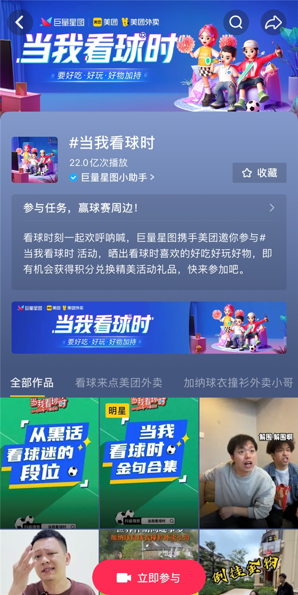 同时,主话题#当我看球时 贴合用户场景,在赛事期间提供了一个互动娱乐场,让用户得以体验千万球迷云看球的参与感;达人内容借势衍生出相关种草好物分享,满足用户的种草需求,将看球变得更有仪式感;同时携手美团外卖打造的兴趣话题,为品牌提供软性植入和高曝光度,助力品牌在与用户深度链接的同时,收获传播与声量的增溢效果。