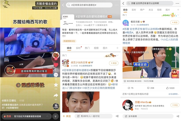 凭借优质内容,微综艺相关话题3次登上抖音、微博热搜,带动「当我看球时」项目在球赛期间收获用户的高频关注。其中,当足球小白想要成为“月抛球迷”时,嘉宾们科普足球的内容话题#足球黑话你都知道哪些# 登上微博总榜39位,阅读量超1.2亿;苏醒追星梅西的相关话题#苏醒是懂追星的 ,登上了抖音娱乐榜33位,最高同时103.3万人在线观看;在阿根廷强势赢下半决赛时苏醒发博,话题#苏醒 全世界还有谁可以这样啊 迅速登上微博总榜12,娱乐榜TOP1,苏醒在微综艺中表白梅西的内容成为话题之下热门内容,收获159w次观看。