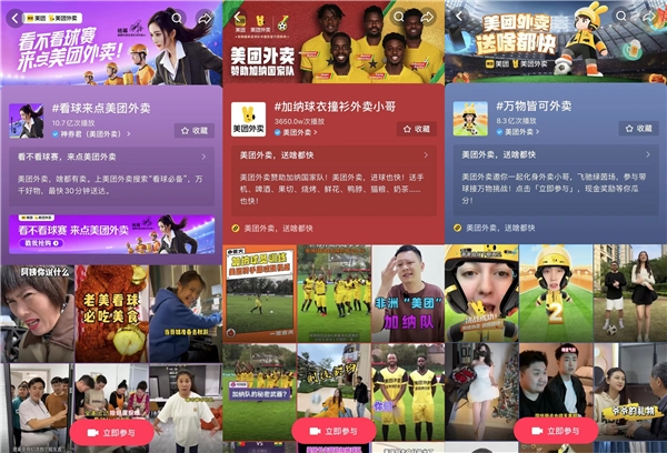 当我看球时,当然少不了美食、好物的陪伴。作为合作品牌,美团外卖不仅在主话题中强势露出,与球赛场景深度捆绑,“来点美团外卖·看球必备”的场景印象逐渐形成,而且基于看球关联场景,美团还定制了一系列高契合度话题,如#看球来点美团外卖、#加纳球衣撞衫外卖小哥、#万物皆可外卖等,不仅迎合用户的看球场景需求,更将热点赛事的话题性与品牌元素柔性连接,这为品牌与用户建造了足够接地气的沟通场。