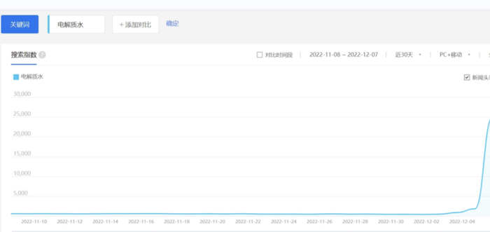 百度指数显示,12月4日以来,电解质水的搜索指数陡增了50倍。在“美团买菜”和“盒马生鲜”平台搜索“外星人”电解质水,均显示“断货”和“补货”状态。