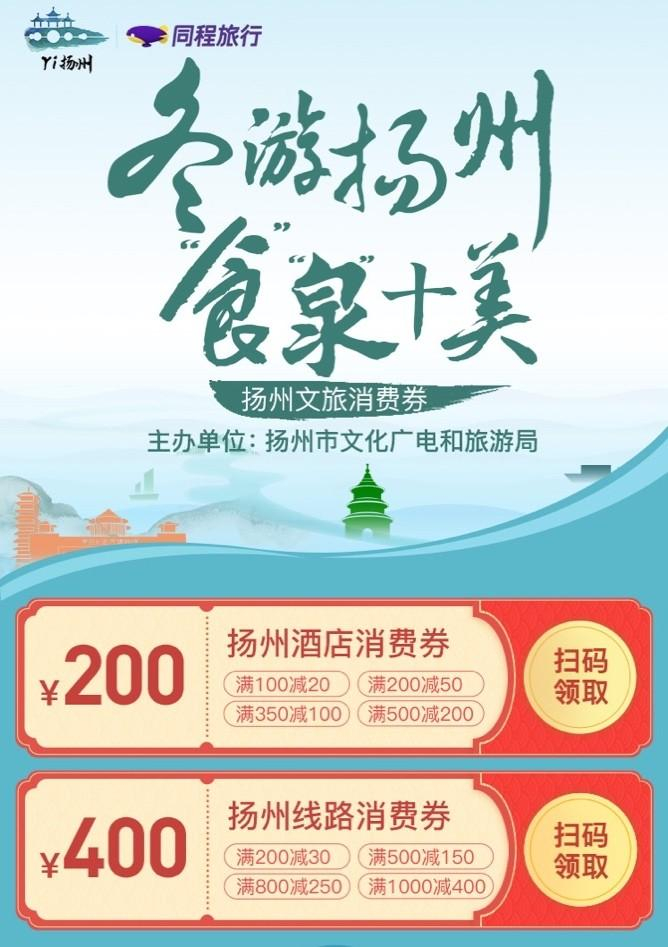 12月28日,扬州市文化广电和旅游局联合同程旅行,推出了主题为“冬游扬州‘食泉’十美” 的百万扬州文旅消费券。该文旅消费券可用于“酒店预订”、“旅行社线路产品预订”、“酒景套餐预订”、“1日游预订”等服务,最高优惠可达400元。全国游客都可在同程旅行平台(APP及微信小程序)首页,搜索框输入“扬州消费券”、“冬游扬州”、“扬州”等关键词,进入活动专题页领取。